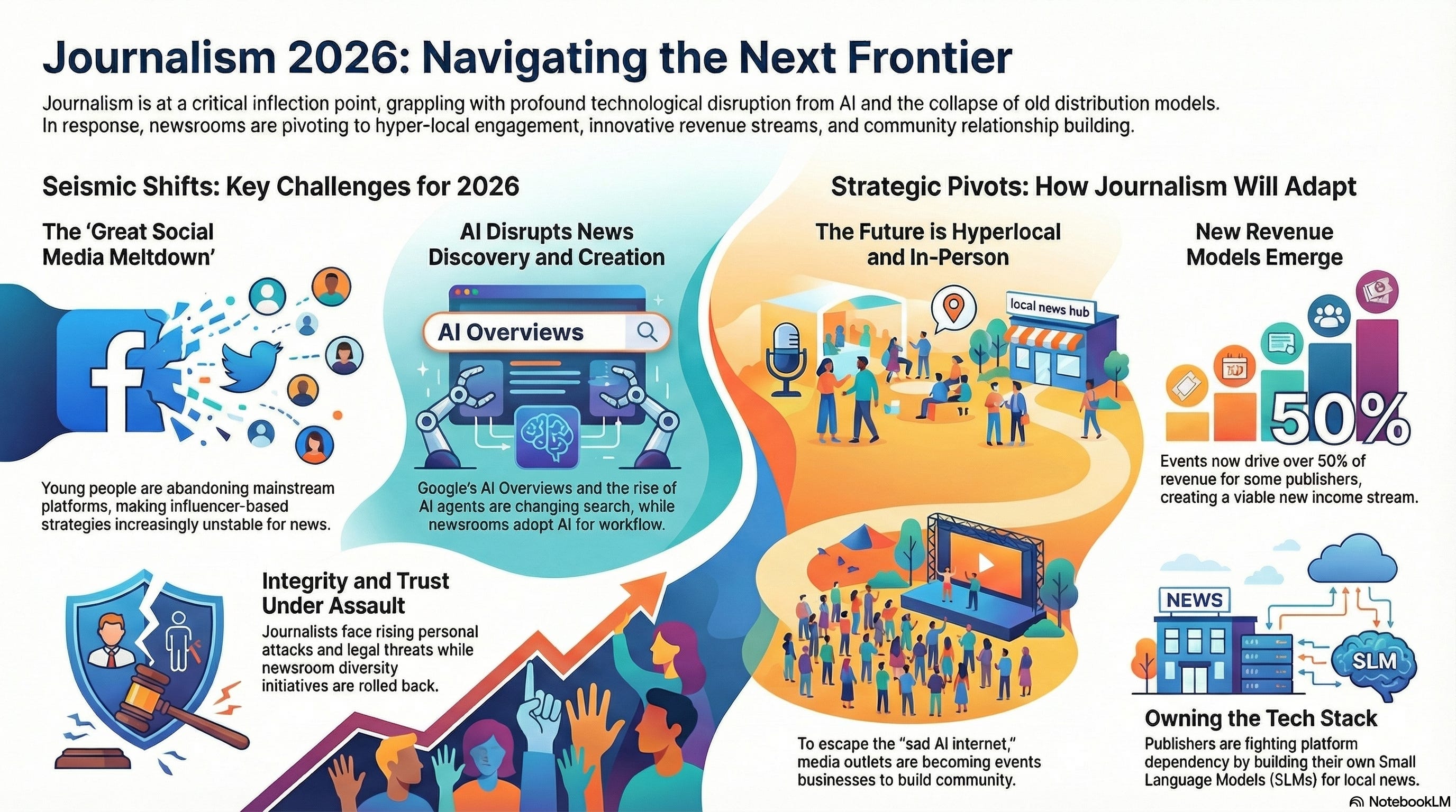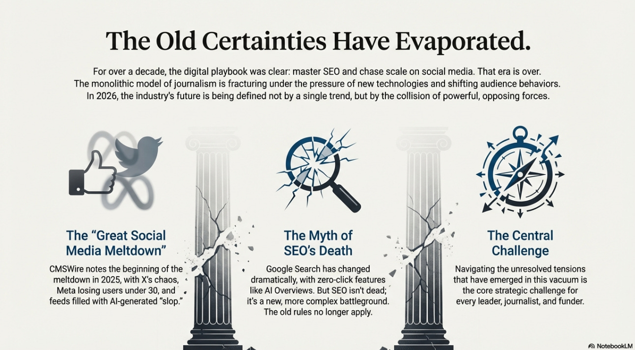 Around the turn of the year, trend reports pile up — so here’s a meta-read of the key “Journalism in 2026” themes, so you only need one recap (plus a few notes from me). If you find it useful, please forward it to a colleague.